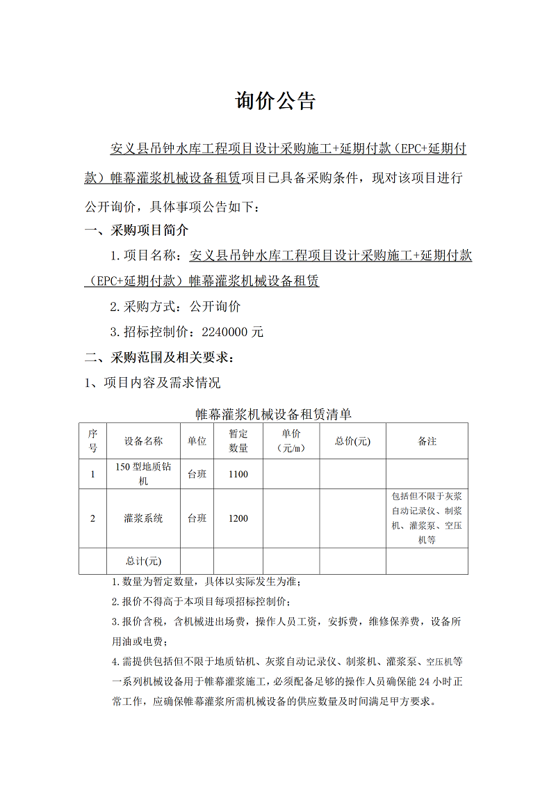 安義縣吊鐘水庫(kù)工程項(xiàng)目設(shè)計(jì)采購(gòu)施工+延期付款(EPC+延期付款)帷幕灌漿機(jī)械設(shè)備租賃項(xiàng)目詢價(jià)公告