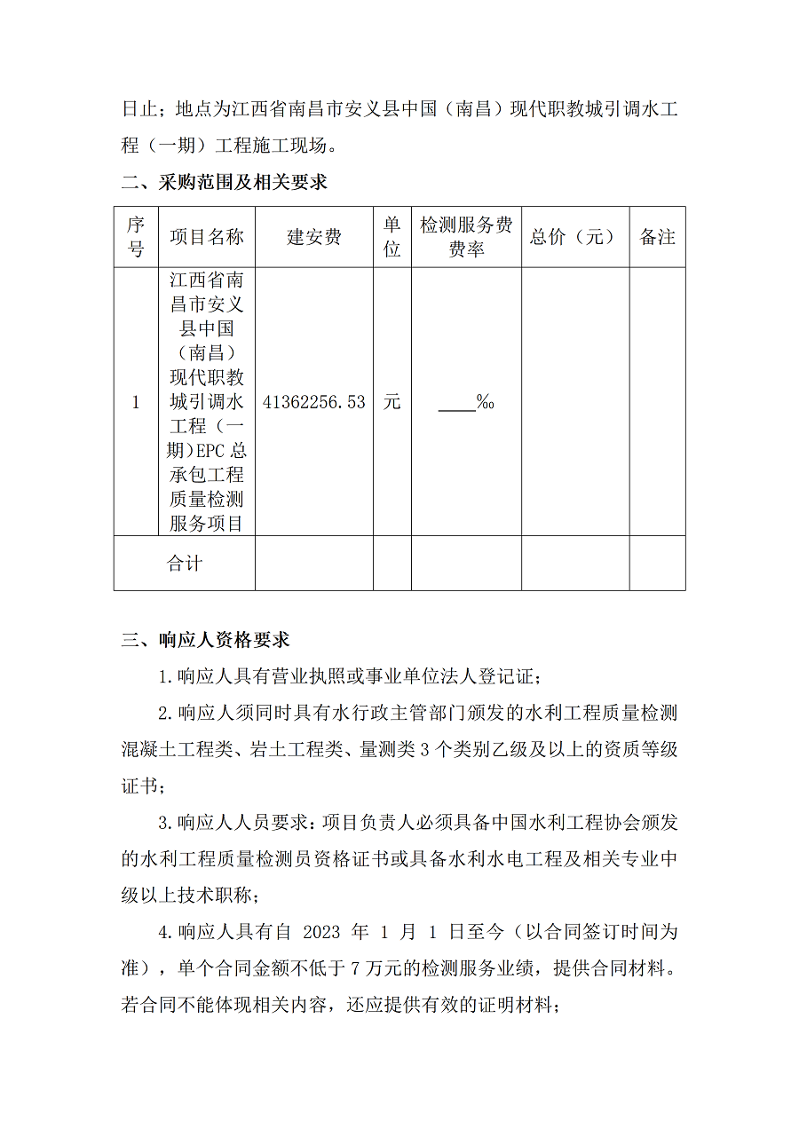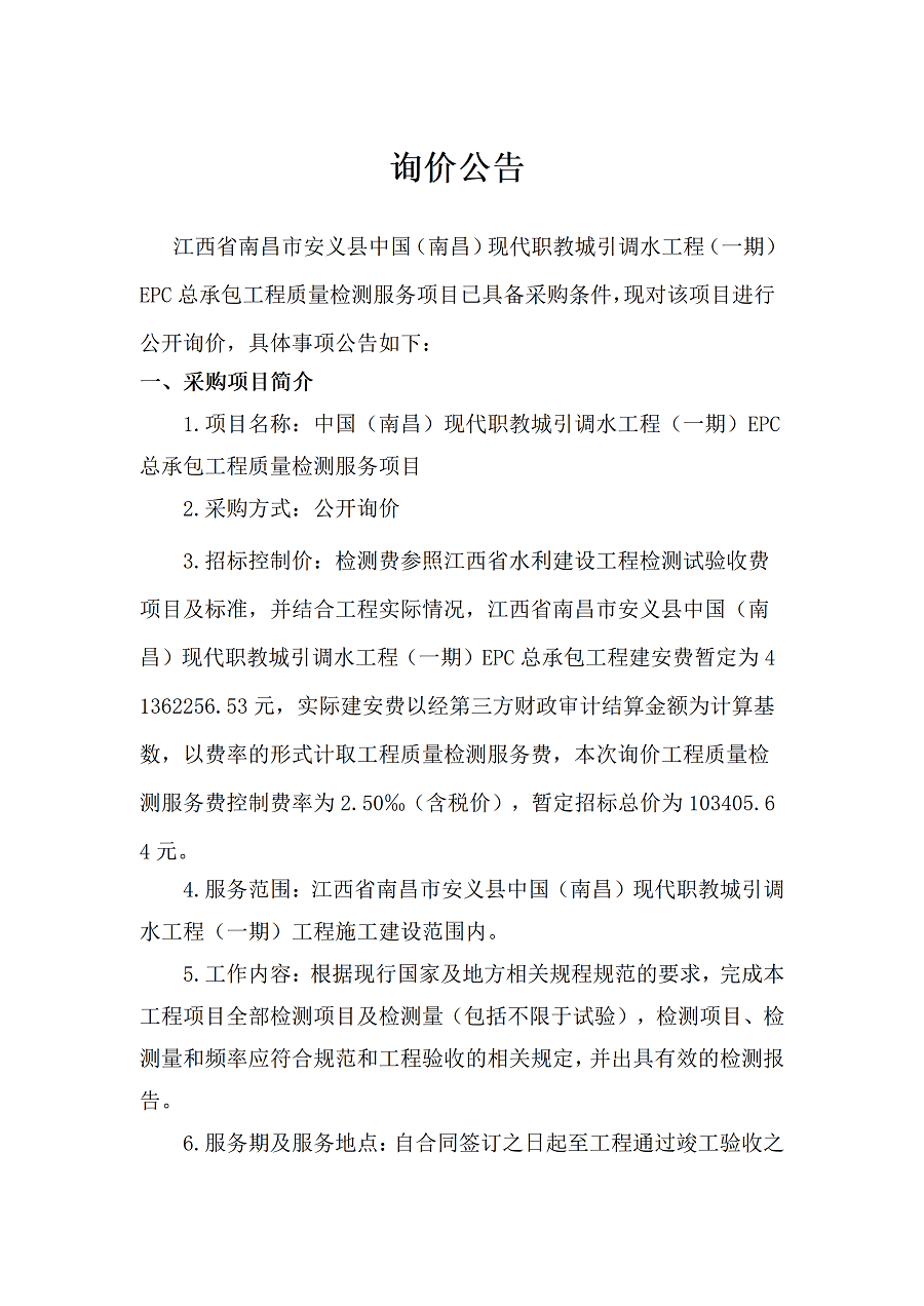 中國(南昌)現(xiàn)代職教城引調(diào)水工程(一期)EPC總承包工程質(zhì)量檢測服務項目詢價公告
