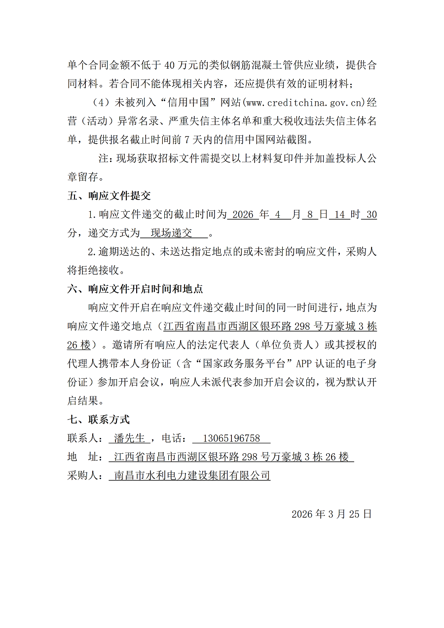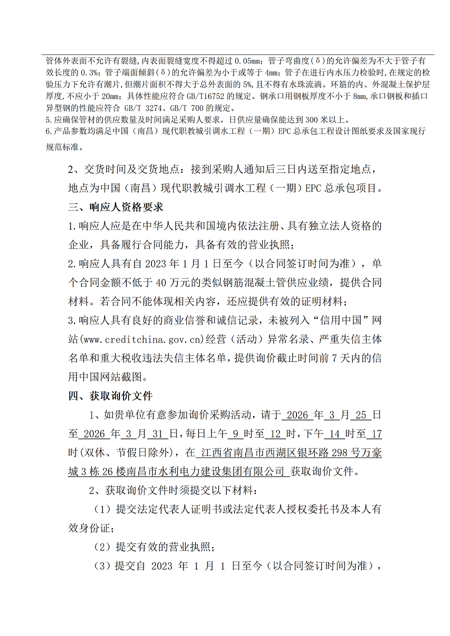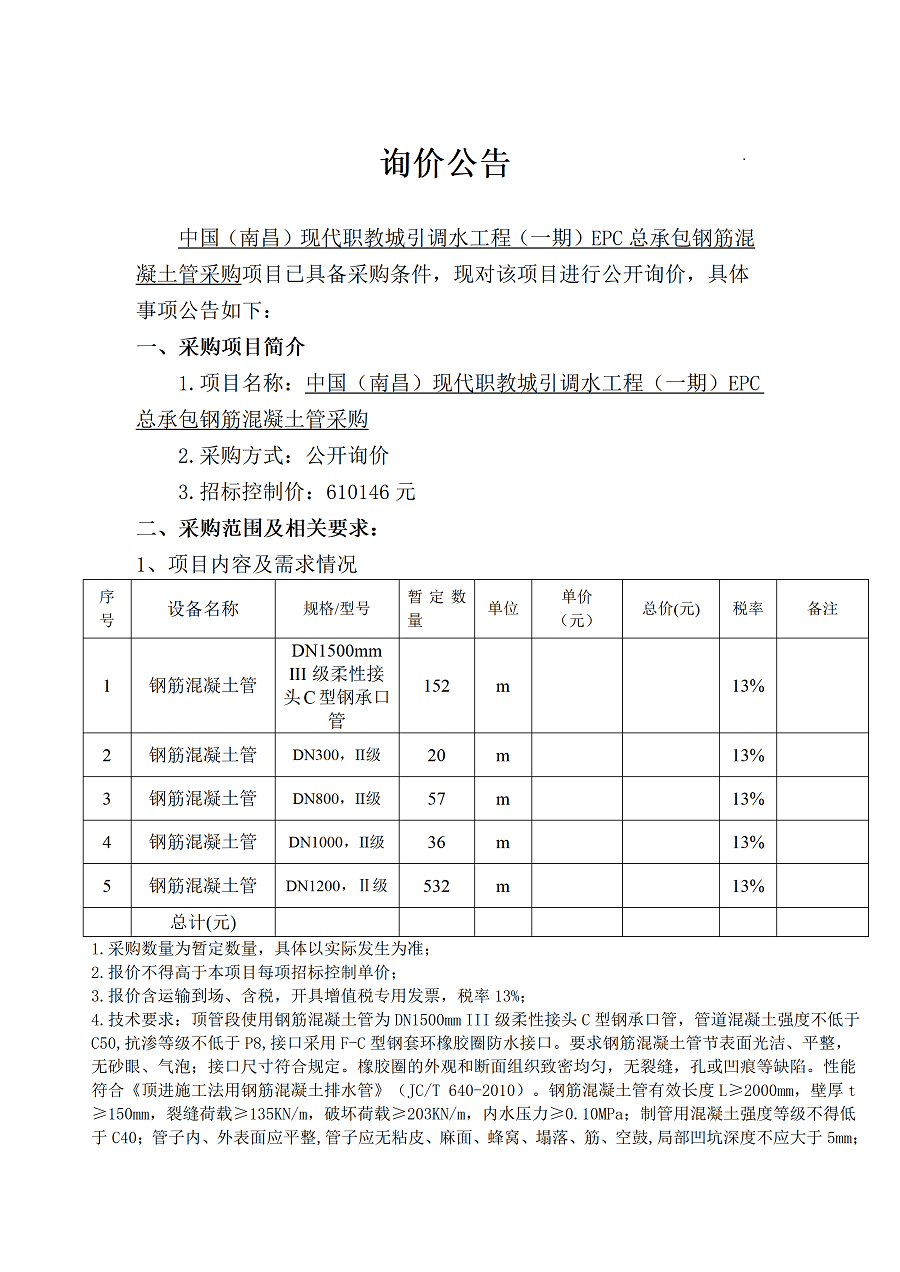 中國(南昌)現代職教城引調水工程(一期)鋼筋混凝土管采購項目詢價公告