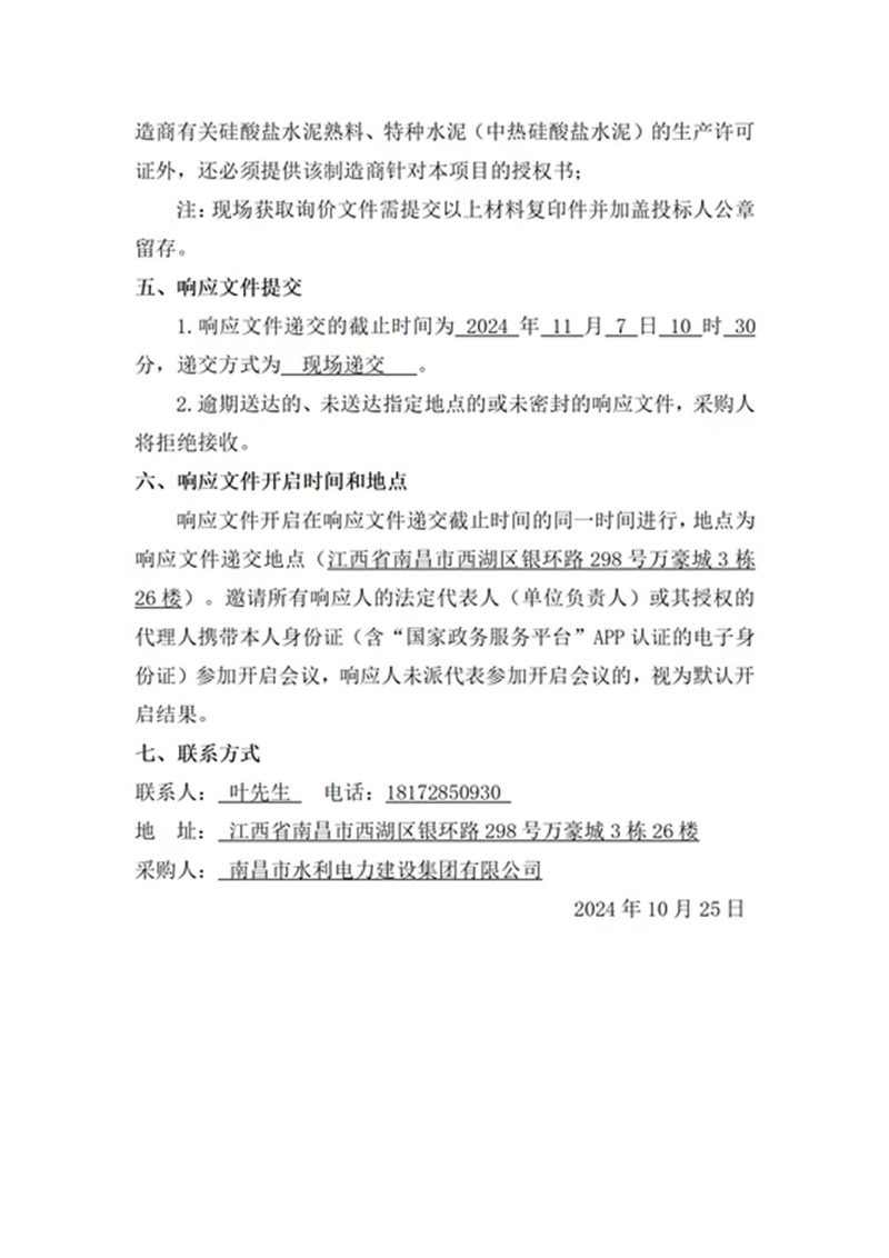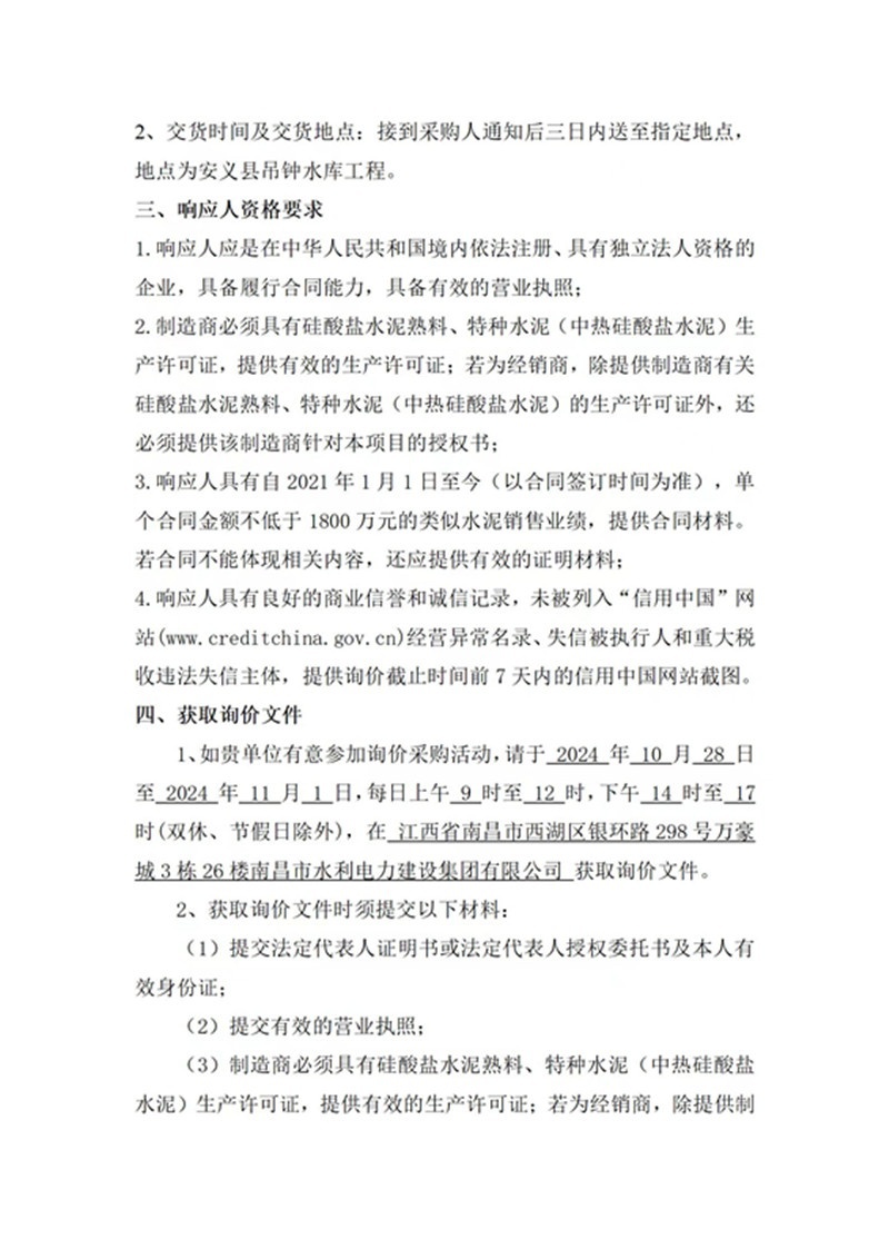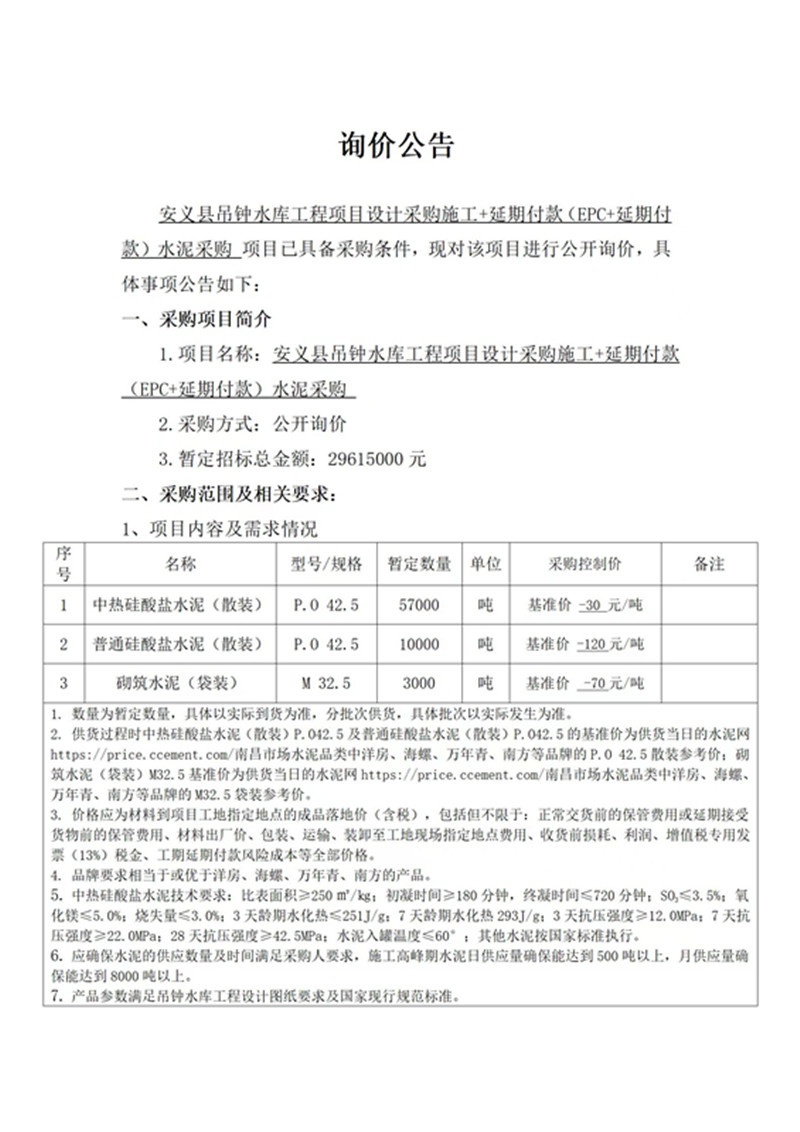 安義縣吊鐘水庫工程項目設(shè)計采購施工+延期付款(EPC+延期付款)水泥采購項目詢價公告