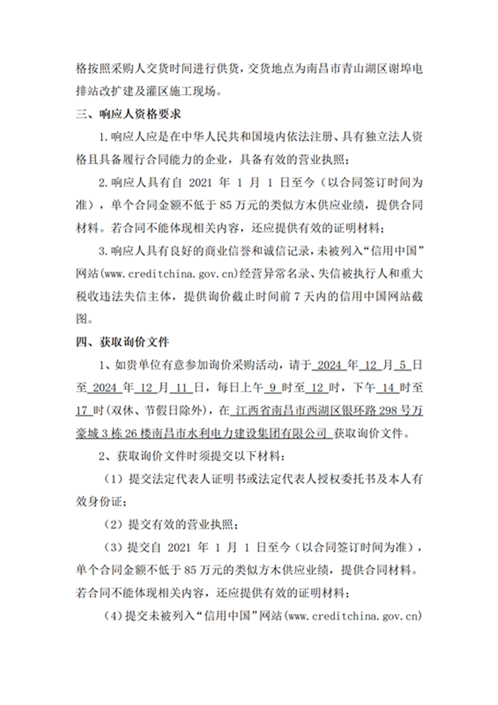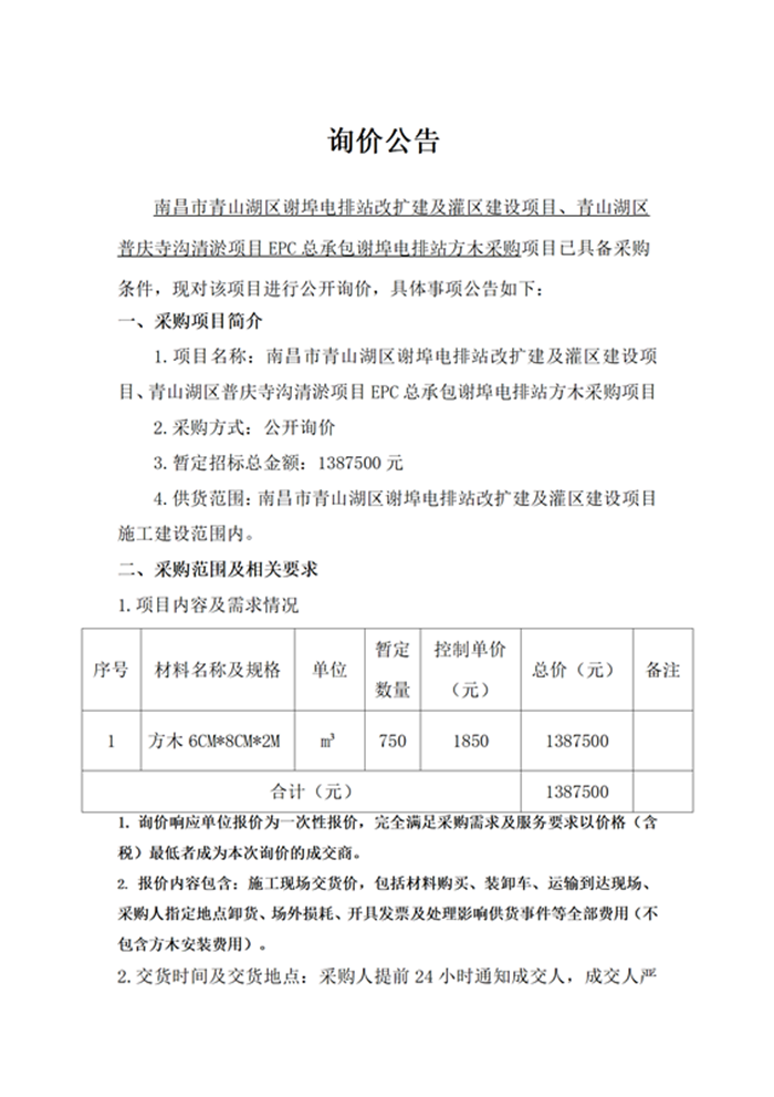 南昌市青山湖區(qū)謝埠電排站改擴(kuò)建及灌區(qū)建設(shè)項(xiàng)目、青山湖區(qū)普慶寺溝清淤項(xiàng)目EPC總承包謝埠電排站方木采購項(xiàng)目詢價公告