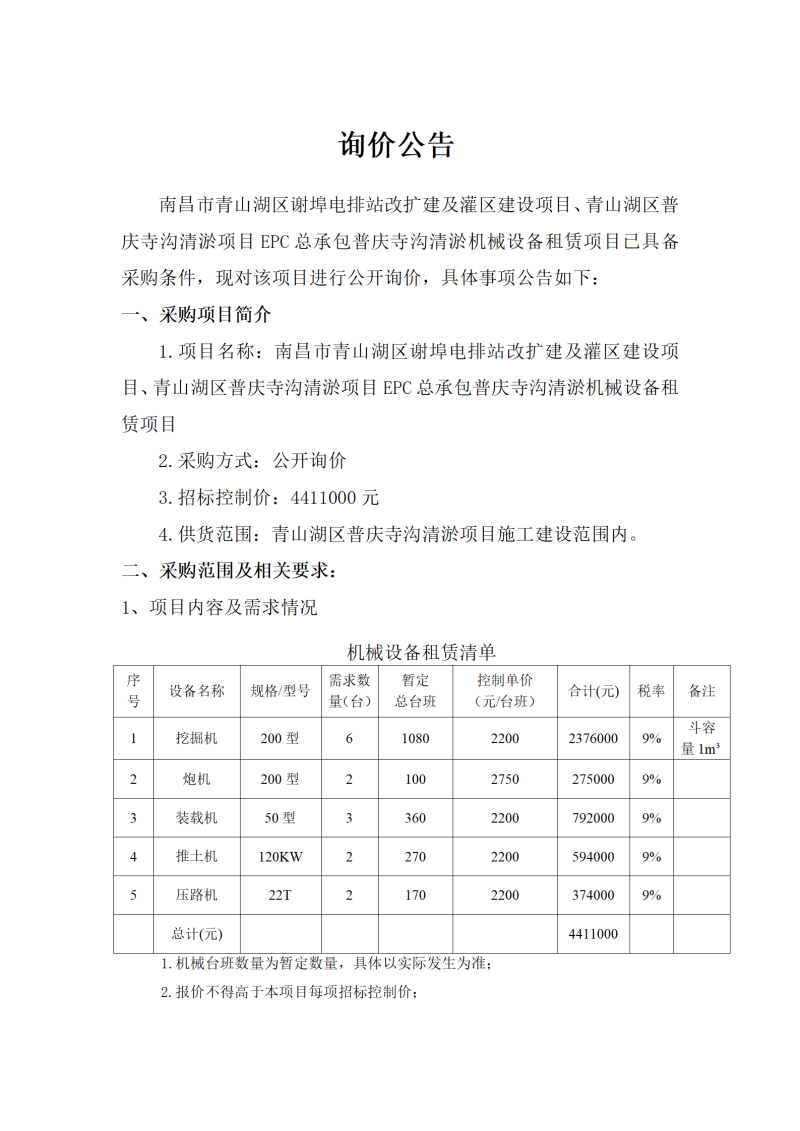 南昌市青山湖區(qū)謝埠電排站改擴(kuò)建及灌區(qū)建設(shè)項(xiàng)目、青山湖區(qū)普慶寺溝清淤項(xiàng)目EPC總承包普慶寺溝清淤機(jī)械設(shè)備租賃項(xiàng)目詢價(jià)公告
