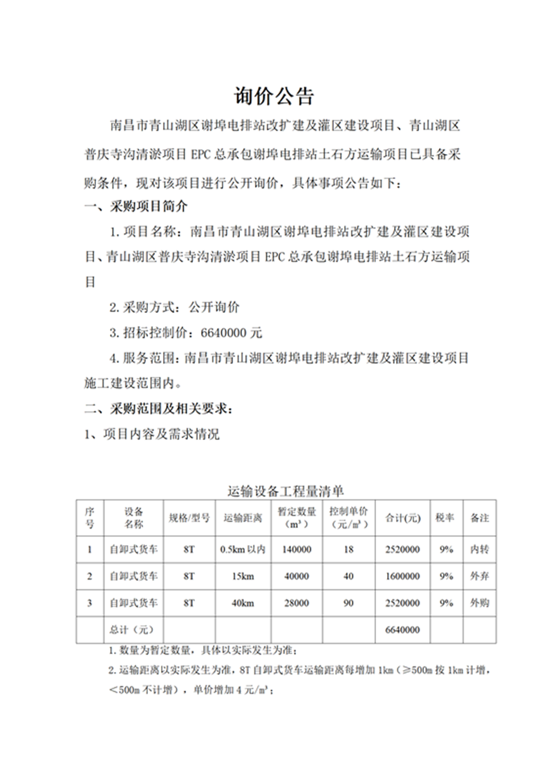 南昌市青山湖區(qū)謝埠電排站改擴(kuò)建及灌區(qū)建設(shè)項目、青山湖區(qū)普慶寺溝清淤項目EPC總承包謝埠電排站土石方運輸項目詢價公告