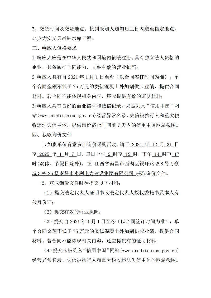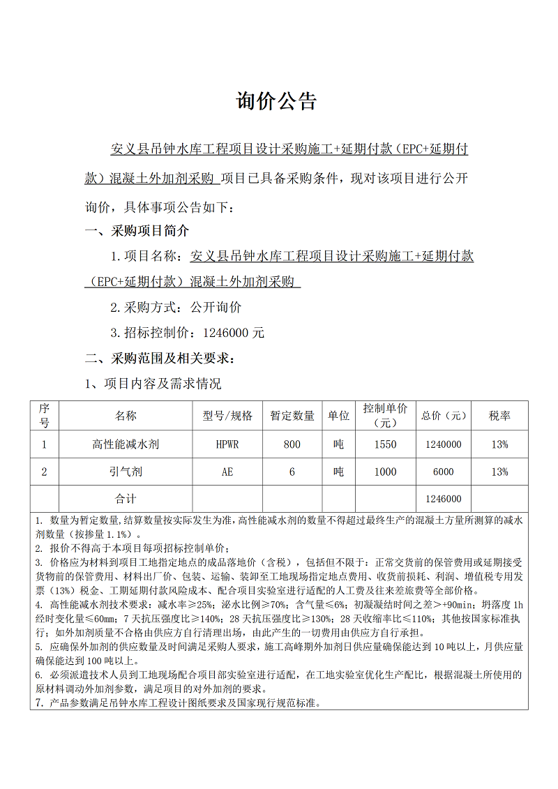 安義縣吊鐘水庫工程項目設(shè)計采購施工+延期付款(EPC+延期付款)混凝土外加劑采購項目詢價公告