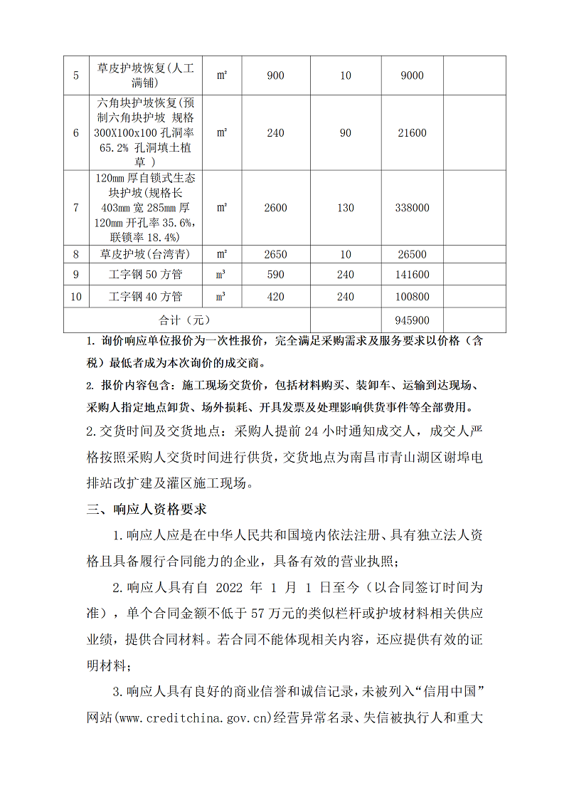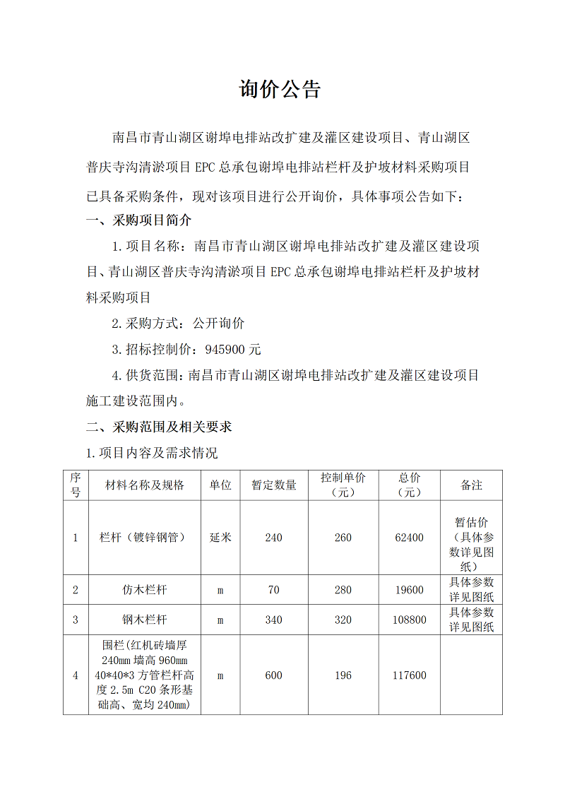 南昌市青山湖區(qū)謝埠電排站改擴(kuò)建及灌區(qū)建設(shè)項(xiàng)目、青山湖區(qū)普慶寺溝清淤項(xiàng)目EPC總承包謝埠電排站欄桿及護(hù)坡材料采購(gòu)項(xiàng)目詢價(jià)公告