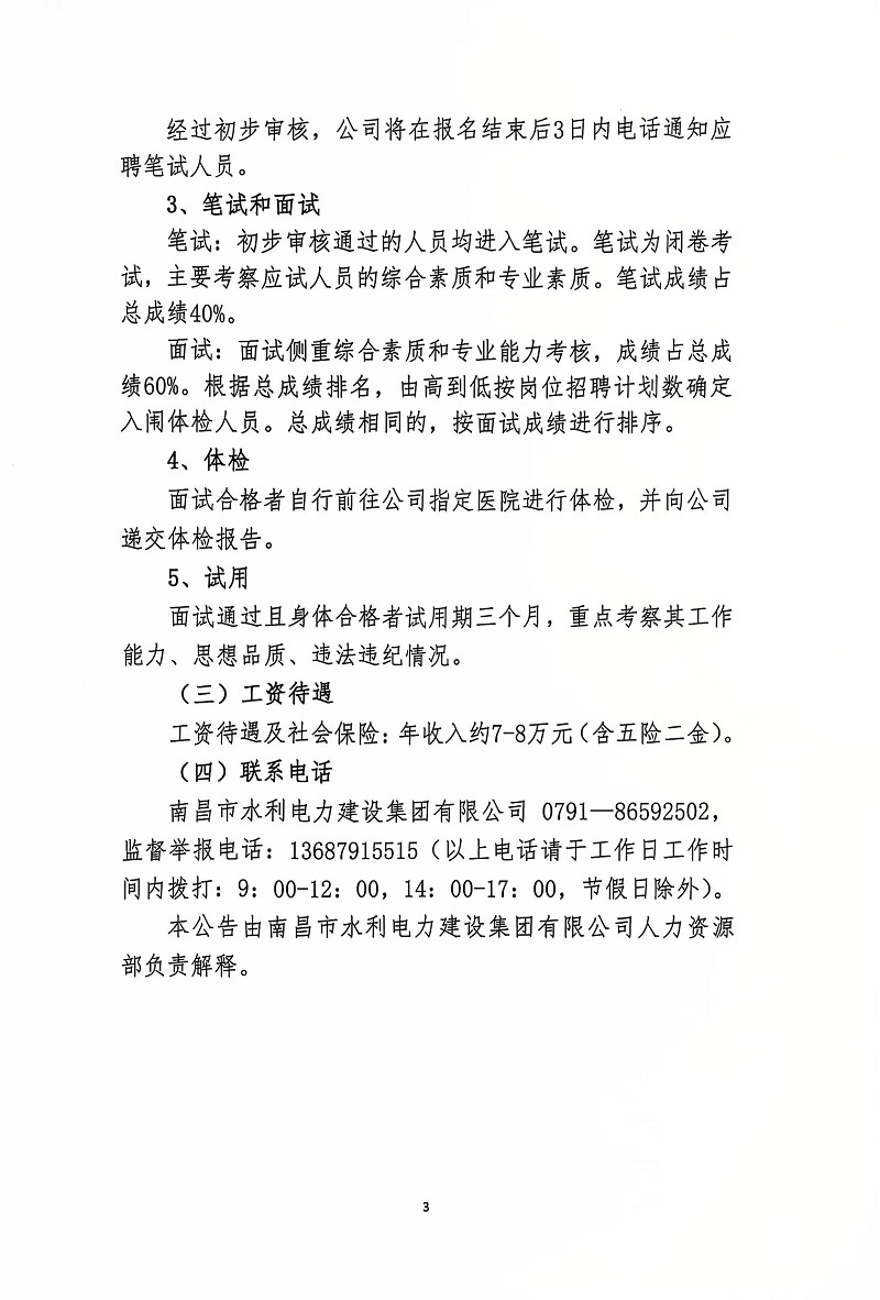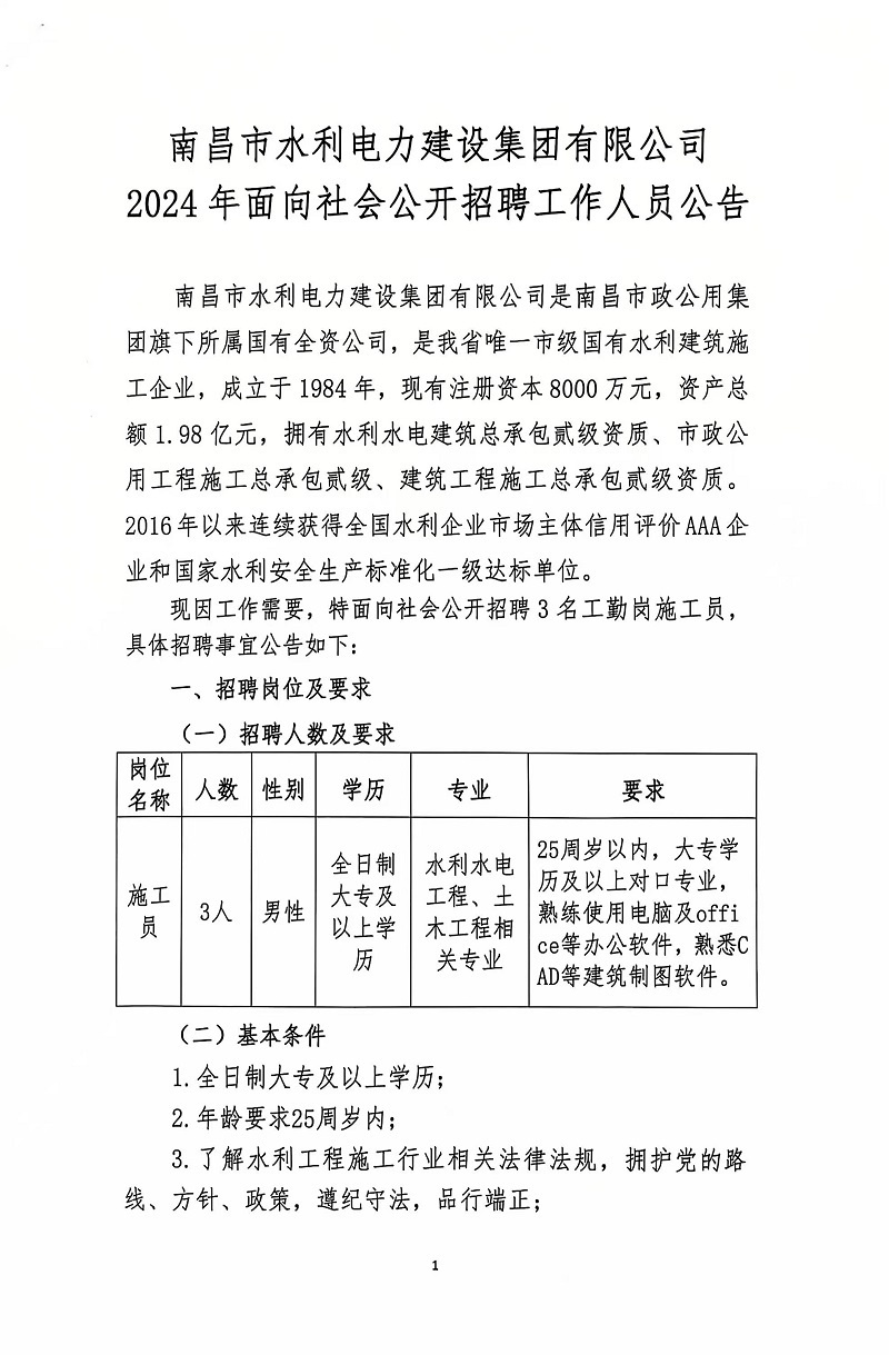 南昌市水利電力建設(shè)集團有限公司2024年面向社會公開招聘工作人員公告